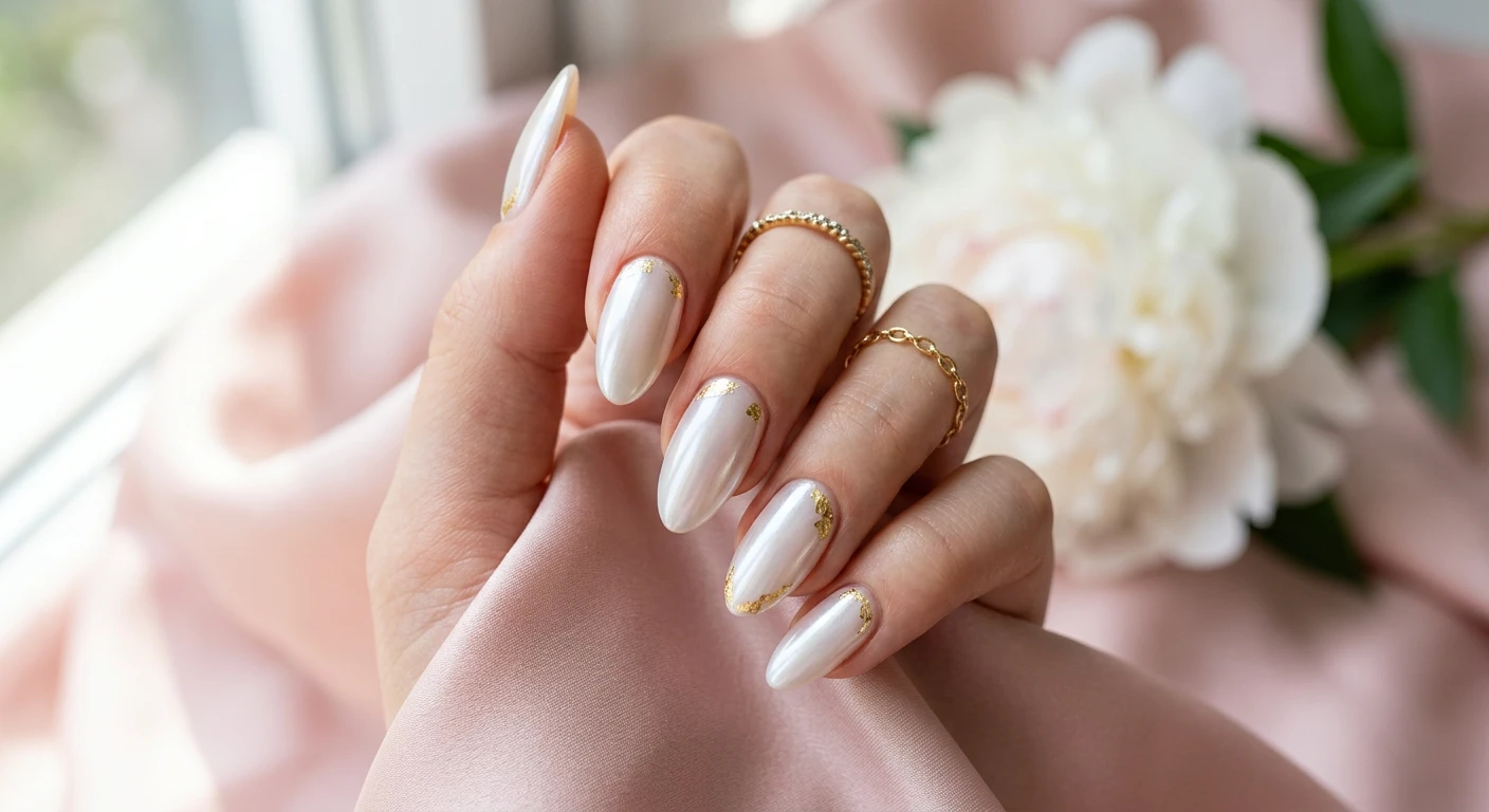 Nail Details: A warm, milky cream base polish applied perfectly on an elegant, medium-length almond-shaped nail. A high-shine pearlescent white chrome powder is thoroughly rubbed over the entire surface, resulting in a luminous, glazed, and iridescent finish that softly reflects pale silver and bright white light. The final look is flawlessly smooth, highly reflective, and ultra-glossy.