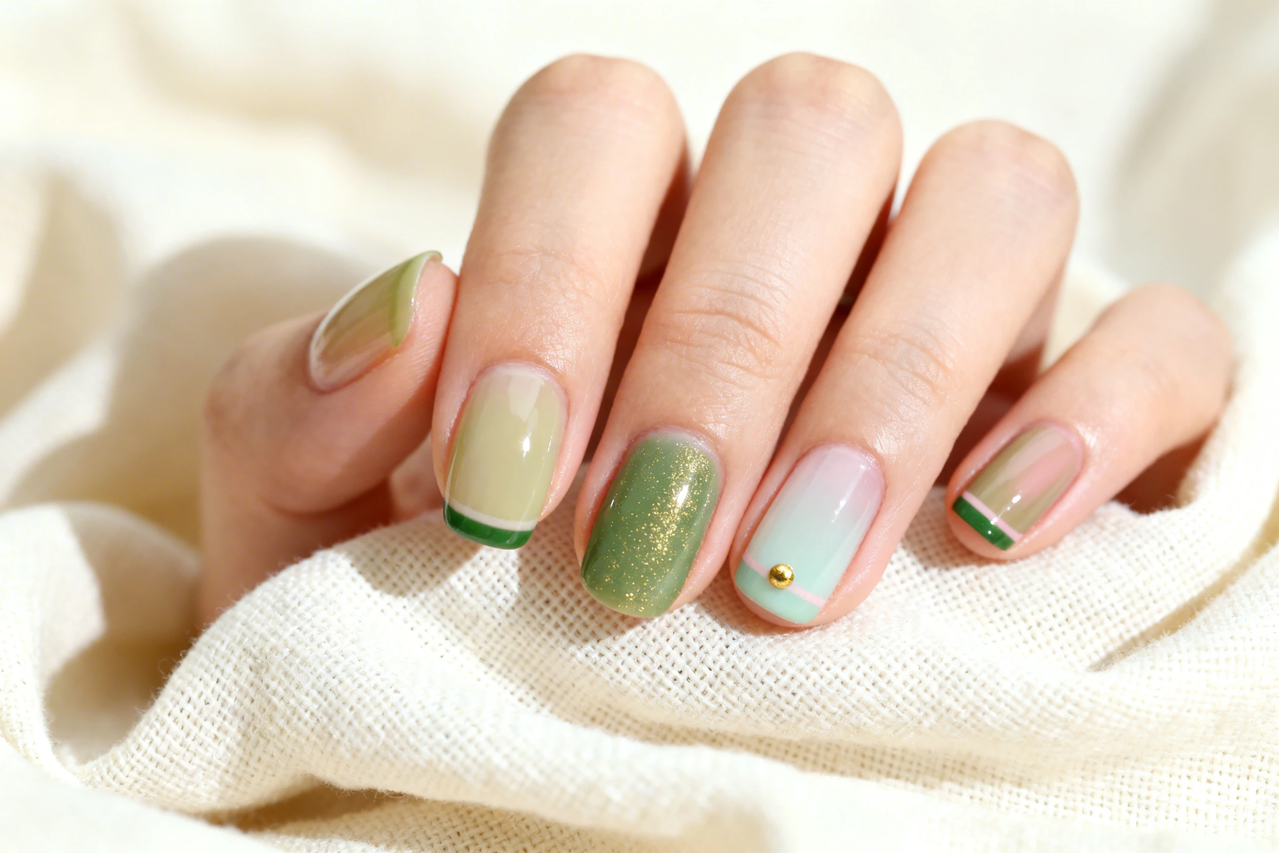 The secret to keeping it chic is keeping the green translucent and diffused. You want a softened haze, not a hard block. If your nails are longer, this fade also elongates the silhouette, especially with a rounded almond shape. It photographs beautifully in natural light—perfect for that morning-coffee shot.