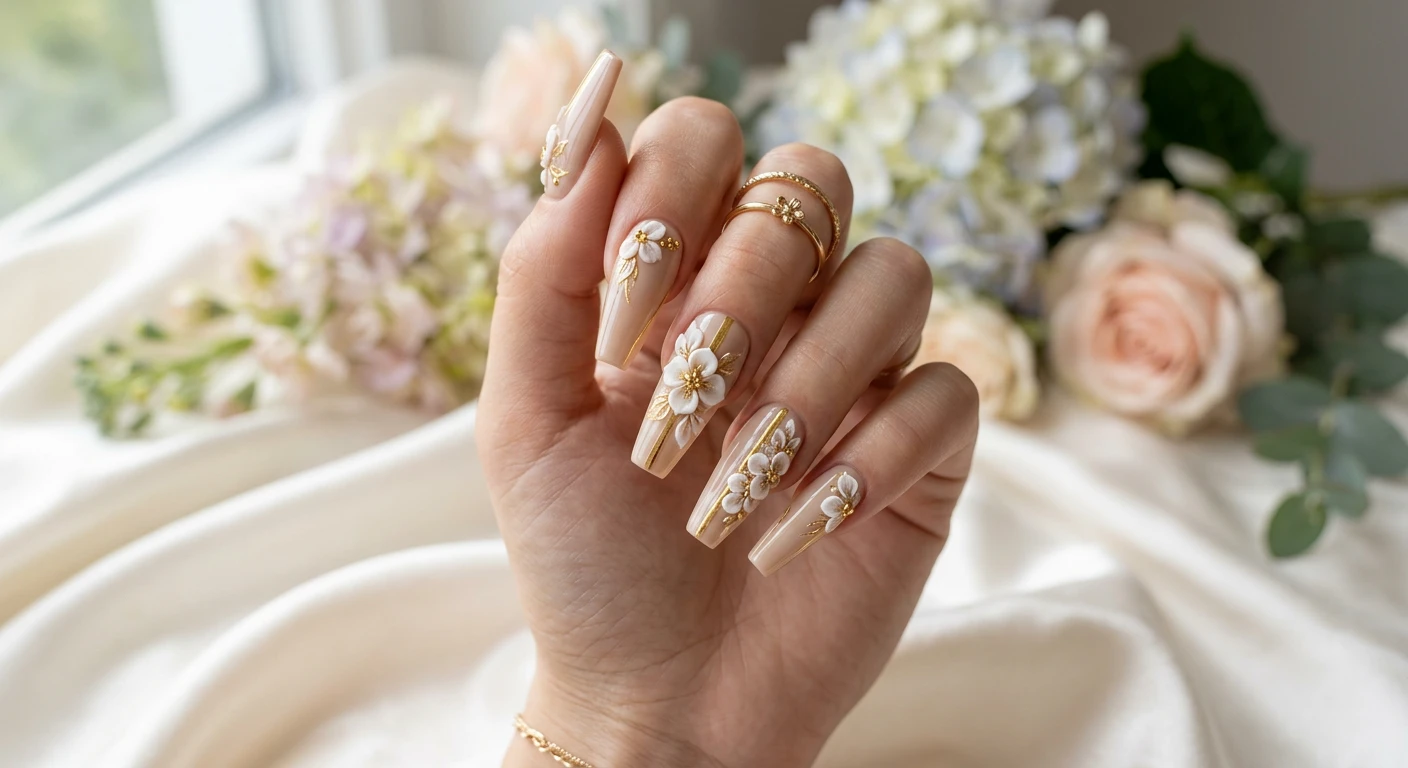 Today, we are talking about the ultimate combination: a flawless, earthy base, crisp metallic lines, and stunning dimensional flowers. This trend marries the sophisticated elegance of a sheer tan polish with the architectural edge of the coffin silhouette. Add in some strategically placed metallic foil and hand-sculpted acrylic flowers, and you have a nail look that is practically a work of art. The three-dimensional element brings an incredible tactile sensation and visual depth that standard flat polish simply cannot achieve.